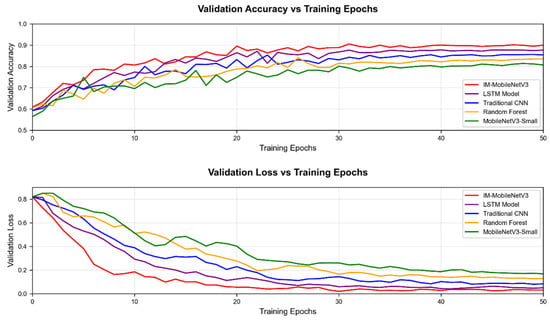 As shown in Figure 11, all models exhibit a trend towards convergence, with no significant overfitting (where the validation loss increases with training rounds) or underfitting (where the validation accuracy or loss stagnates at a poor level too early). Notably, IM-MobileNetV3 achieved the highest final accuracy and the lowest final loss on the validation set, indicating that it not only trains effectively but also demonstrates strong generalization capabilities.