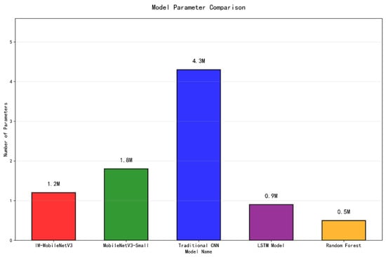 Figure 12 compares the parameter sizes of five models. The optimized IM-MobileNetV3 model shows a 33% reduction in parameters compared to the original MobileNetV3-Small, which is significantly lower than the CNN model but slightly higher than the LSTM model and the random forest model. Although it ranks in the middle of the five models in terms of parameter size, IM-MobileNetV3 maintains its lightweight characteristics, with moderate structural complexity, meeting the requirements for real-time detection in cloud environments.