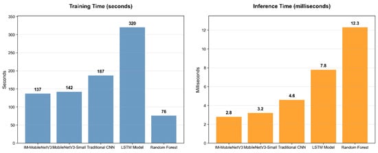 Figure 13 compares the training time and inference time the models require for a single sample. IM-MobileNetV3 takes 137 s to train, which is only slightly higher than the random forest model with the fewest parameters and significantly lower than LSTM, CNN, and MobileNetV3-Small, indicating its high training efficiency. The inference time is the shortest among all models, at just 2.8 ms, far below random forest and LSTM, and less than one-quarter of the random forest’s time. Real-time detection involves processing new data using a pre-trained model, which places greater emphasis on the inference time for a single sample. The model only requires occasional updates, i.e., retraining, and the IM-MobileNetV3 model still demonstrates a significant advantage in real-time performance. These results indicate that the IM-MobileNetV3 model has low complexity and high efficiency.