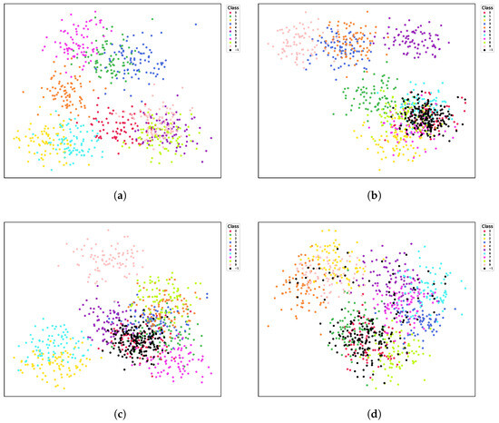 t-SNE visualization of features on CIFAR10 from different encoders. (a): Clean Encoder. (b): BASK-poisoned encoder without defense. (c): Badencoder-poisoned encoder without defense. (d): BASK encoder after MKD defense. (e): Badencoder encoder after MKD defense. (f): BASK encoder after NC defense. Each color denotes a class, and the black scatter points labeled −1 are the samples with the backdoor trigger.