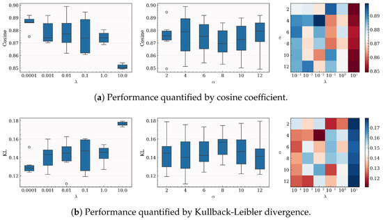 Here, we investigate the impact of the hyperparameters and on the performance of our algorithm. Specifically, we define the value range of and as , where . As described in Section 5.2, we conduct the experimental procedure with for each pair of hyperparameter values within , obtaining the performance of the algorithm under each pair of hyperparameter values within . The experimental results are visualized in Figure 2. In the heatmap, the x-axis and y-axis represent the values of and , respectively, while the color indicates the performance quantified by the cosine coefficient or Kullback–Leibler divergence. The box plot shows the marginal impact of the hyperparameters or on the algorithm’s performance. It can be observed that the algorithm generally performs better when is small and that the impact of on performance is relatively minor. Therefore, in the actual implementation of the algorithm, can be typically set to a small value.