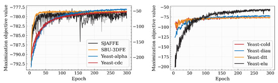Here, we demonstrate the convergence of the inference process of our proposed algorithm. As illustrated in Figure 3, the proposed algorithm demonstrates steady convergence behavior across multiple datasets. The curves are differentiated by color for each dataset and transparency for varying values. The results indicate that our algorithm rapidly approaches the optimal objective value within the first 100 iterations. This initial phase exhibits a steep descent, suggesting efficient gradient updates or search direction alignment. Subsequently, the optimization stabilizes, with marginal improvements in later iterations, indicating convergence to a near-optimal solution. The consistency of this trend across most datasets highlights the robustness of our algorithm to different data distributions.