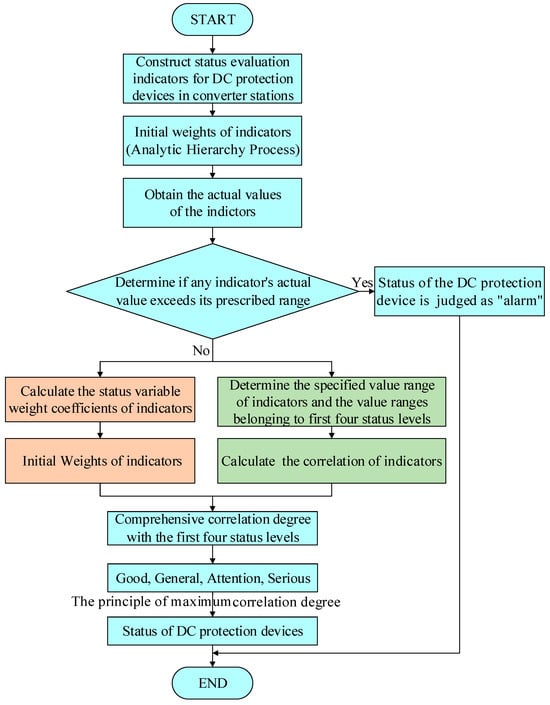The status assessment flowchart for the DC protection device is shown in Figure 5. First, the actual values of the indicators are obtained. It is then determined if any indicator’s actual value exceeds its prescribed range. If any indicator exceeds its specified range, the status of the DC protection device is directly judged as “alarm.” If no indicator exceeds its prescribed range, the initial weight of each indicator is first determined based on the Analytic Hierarchy Process (AHP). Then, according to the actual values of the indicators and variable weight theory, the variable weight of each indicator is determined. The correlation degree function is used to determine the correlation degree of the indicators with the first four status levels. Subsequently, the correlation degrees of the status assessment indicators belonging to the same status level and their corresponding indicator weights are subjected to a weighted sum to obtain the comprehensive correlation degree of the DC protection device with the first four status levels:
