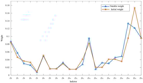 Since the state variable weighting coefficients for the operating environment indicators are all 1, there is no need to apply variable weighting to these indicators, meaning their weights do not change. The weights of the indicators before and after the change are shown in Figure 6.