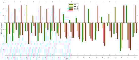 As can be seen from Figure 7, most of the indicators with larger correlation values for DC protection device D fall into Level III. This indicates that the values of most indicators for the DC protection equipment are primarily within the attention range, suggesting that the overall status of the DC protection equipment is not very good. This finding is consistent with the final evaluation result of DC protection device D in Table 5.