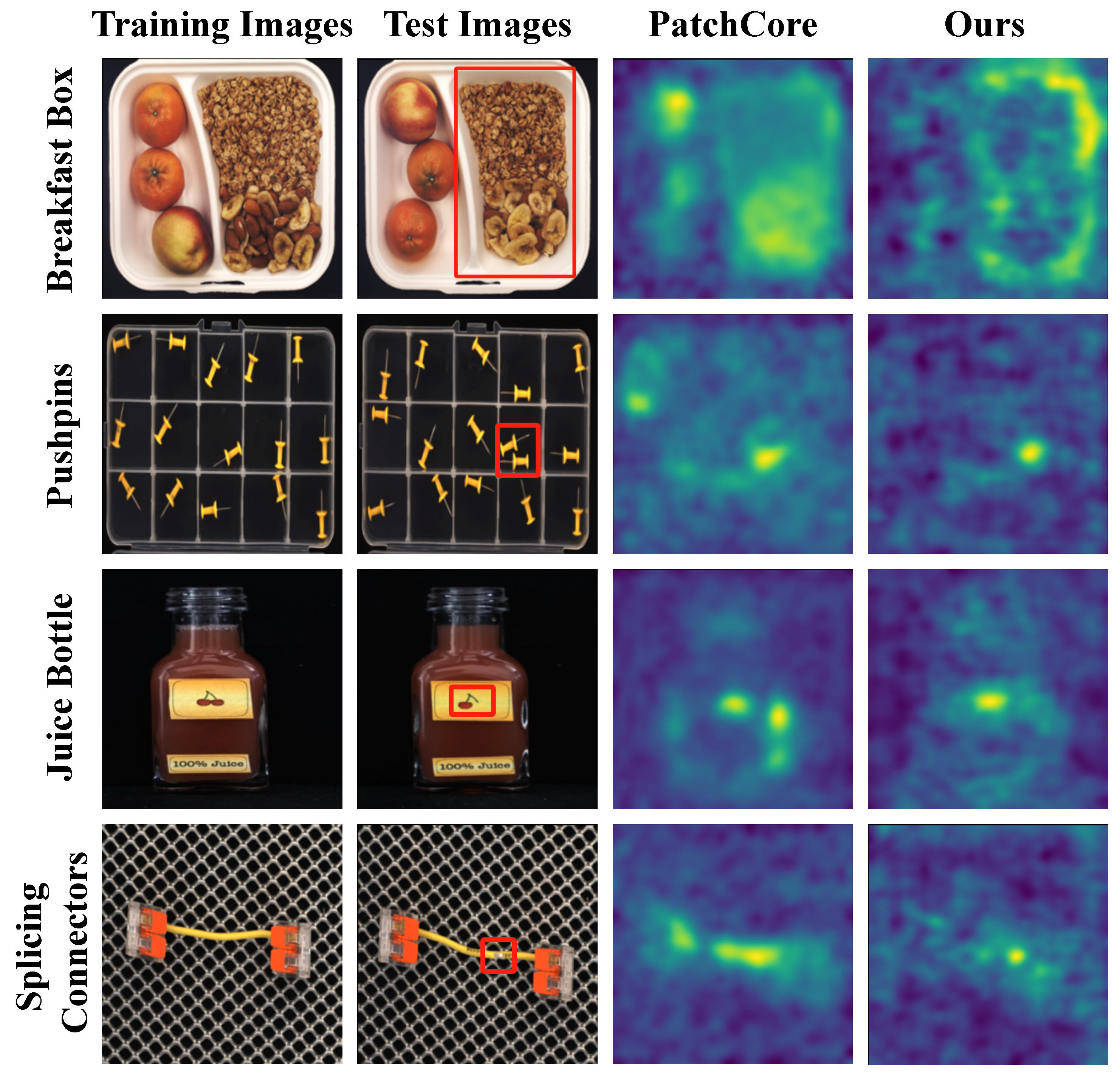 Figure 2, during the training phase, the normal images are used to generate patch features and segmentation maps, which are then stored in their respective memory banks. Specifically, (1) the patch-feature memory bank stores patch-level features that capture fine-grained details of the image, and (2) the segmentation-map memory bank assists in determining the validity of various component combinations to identify logical anomalies. During the test phase, the differences between the patch feature and segmentation maps of the test image and those of the training images are computed separately. Finally, the distances are calculated to derive the anomaly score. The pseudo-code of the training and test procedure is shown in Algorithm 1.