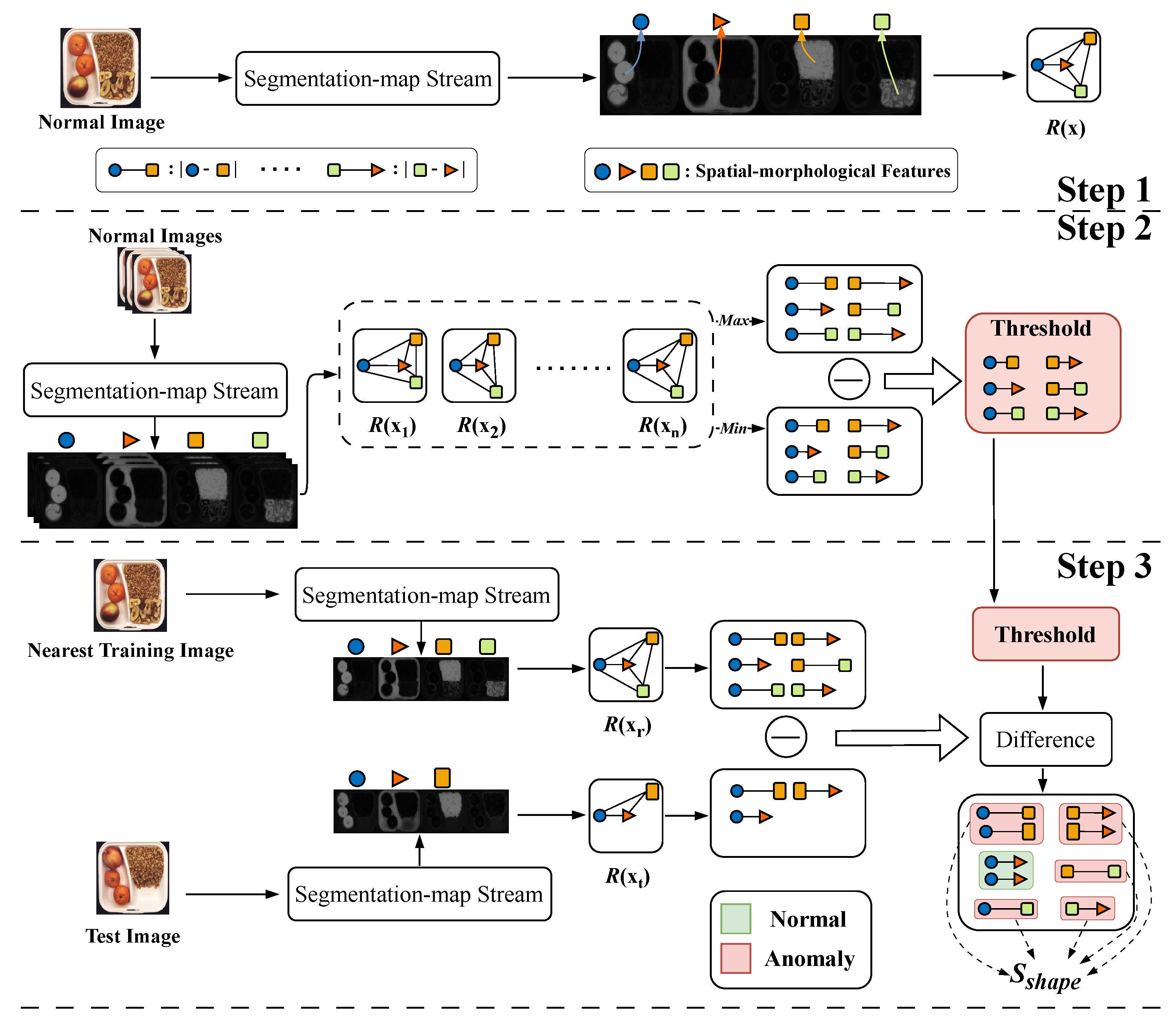 However, we find that the computation of distances between normal and test images based on the aforementioned features is relatively independent, leading to insufficient anomaly scoring and limited generalization across complex scenarios. To address this problem, based on anomalies that often exhibit specific spatial–morphological patterns, we additionally design a new distance calculation method that incorporates spatial–morphological features–centroid (), area ratio (the ratio of the number of pixels in the segmented region to the total image), and variance v to model inter-component relationships from a shape-based perspective. The centroid captures positional consistency, quantifies size conformity relative to the entire image, and v measures shape regularity or distribution dispersion. The computing steps are as follows: