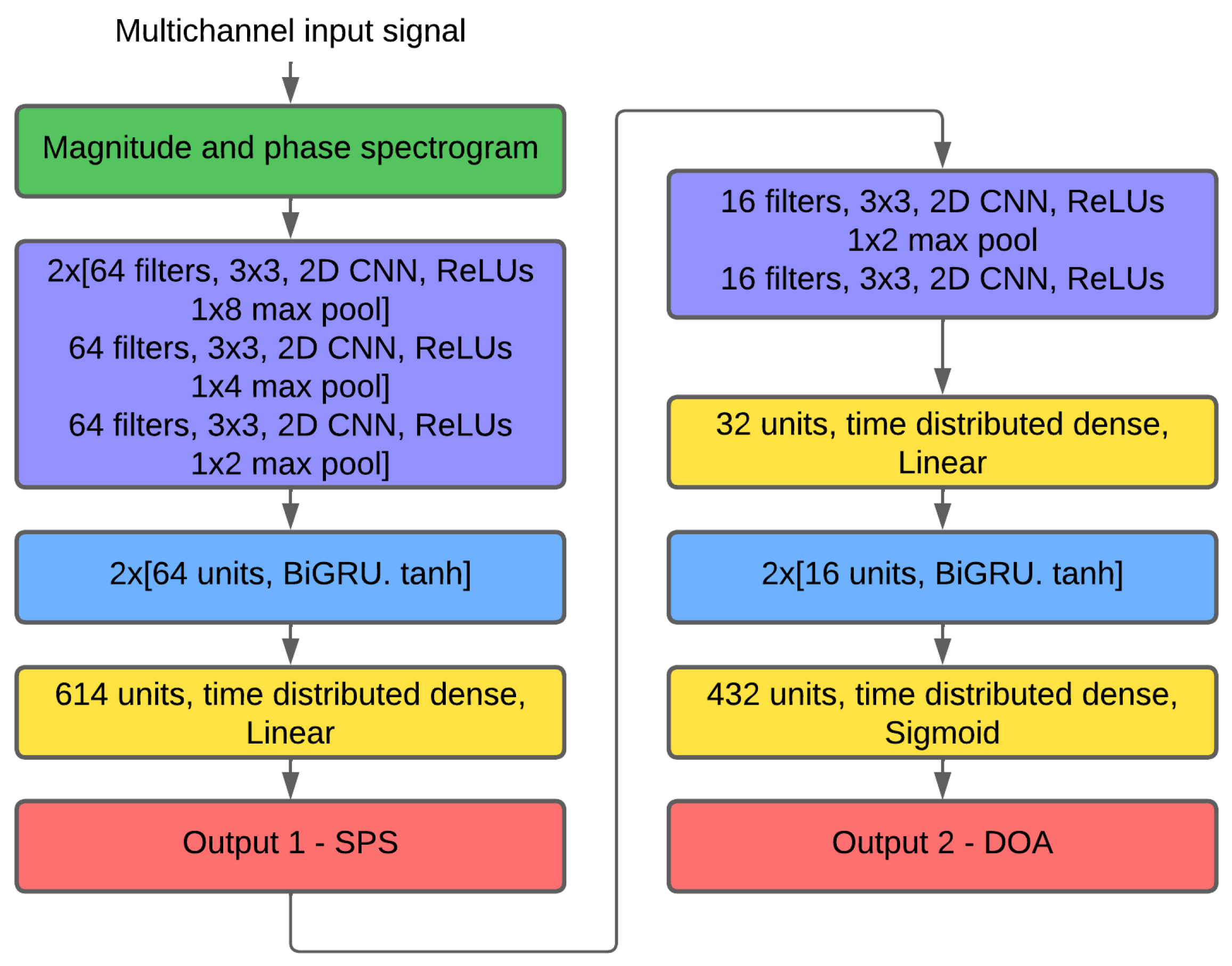 - DOA head: Uses softmax activation across 36 distinct angular classes, optimized with categorical cross-entropy loss. This is the primary output for our classification-based DOA estimation.