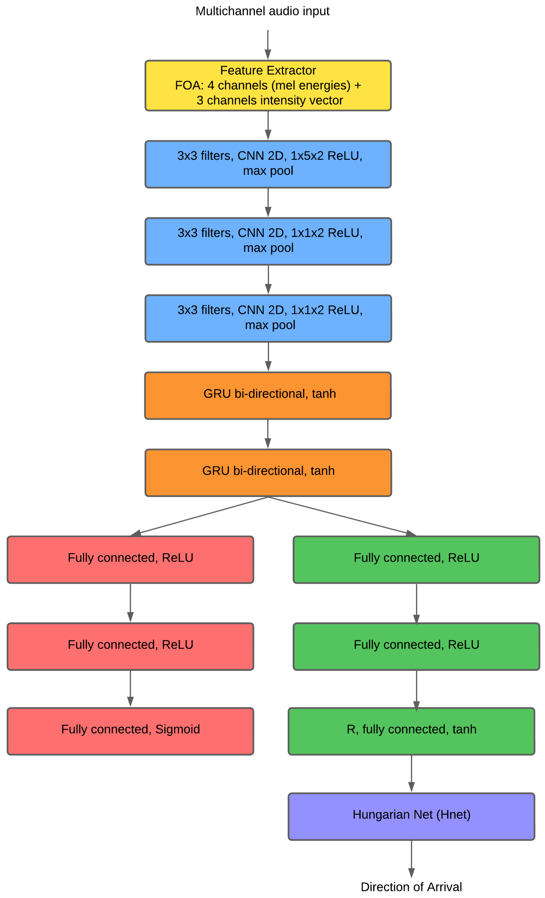 - SED head: Uses sigmoid activation. However, for the specific objectives of this study, this head was deactivated, meaning we did not train or use M-SELDnet for sound event detection, focusing solely on its localization capabilities.