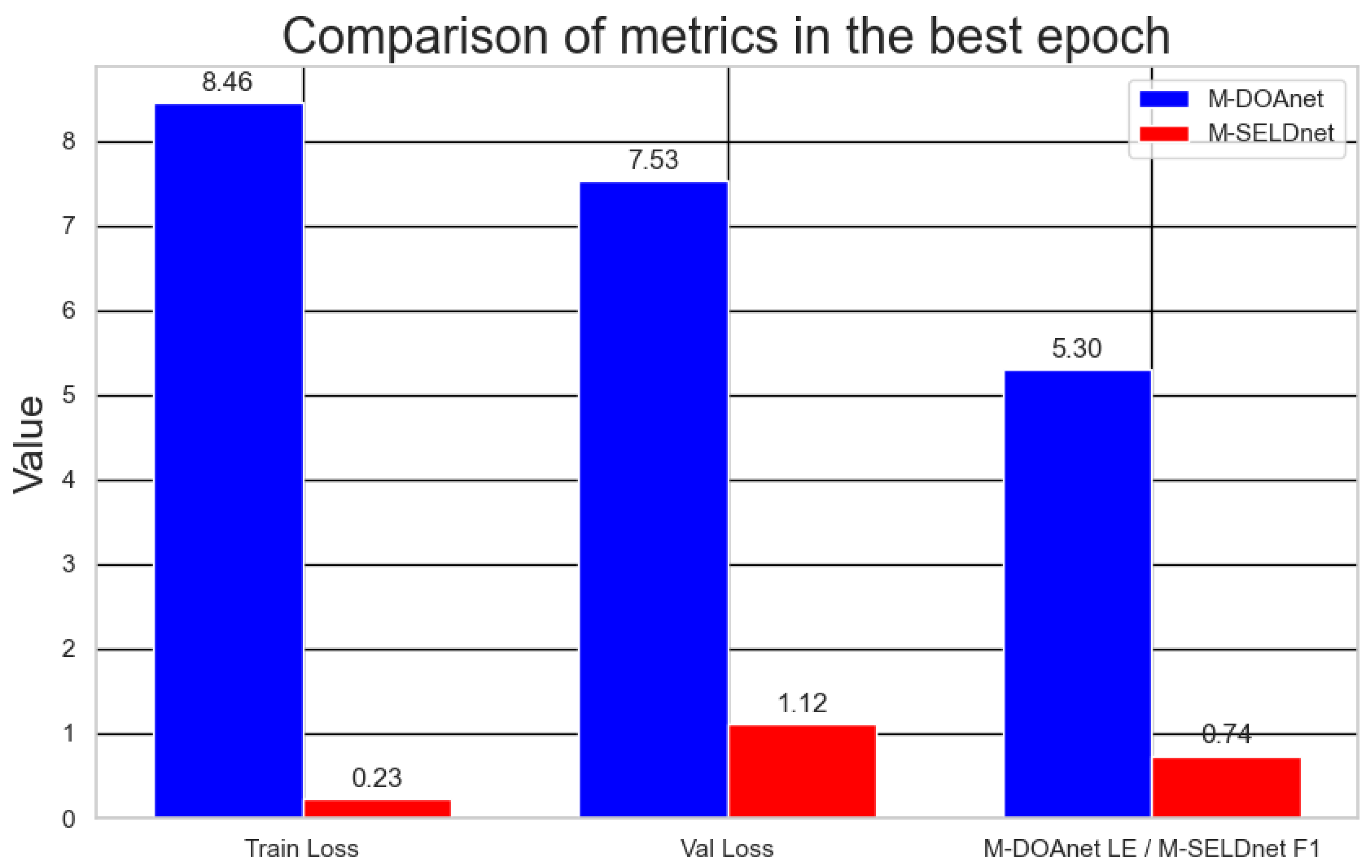 - DOA Error: This metric, which quantifies angular discrepancy, started at relatively high values. Over the course of training, the DOA error decreased steadily, reaching values between 0.32 and 0.34 radians in the final epochs. This consistent reduction indicates improved spatial localization accuracy by M-SELDnet.