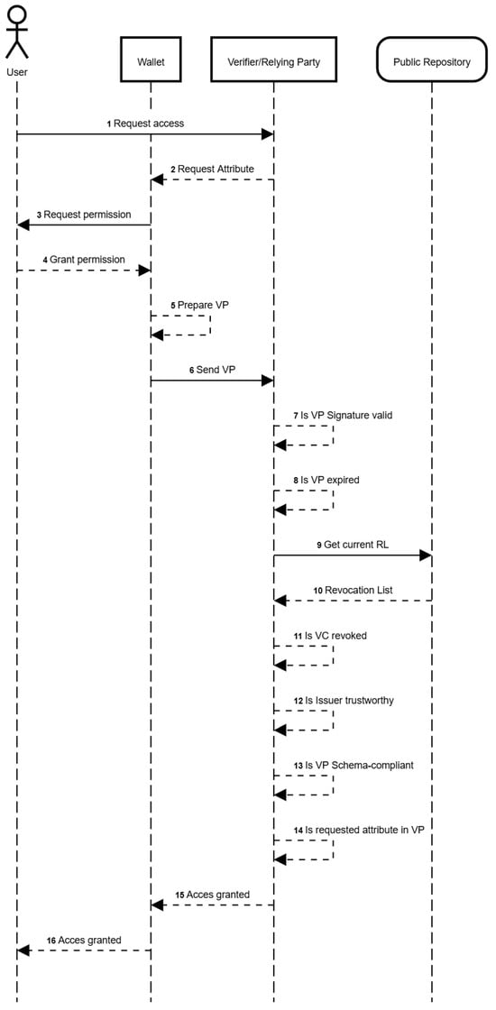 - Verification and Validation—The attributes must be verifiable by relying parties using publicly available certificates or trust lists (e.g., the EU Trusted List). In this way, there should be implemented mechanisms for revocation and status checking (e.g., OCSP or CRL);