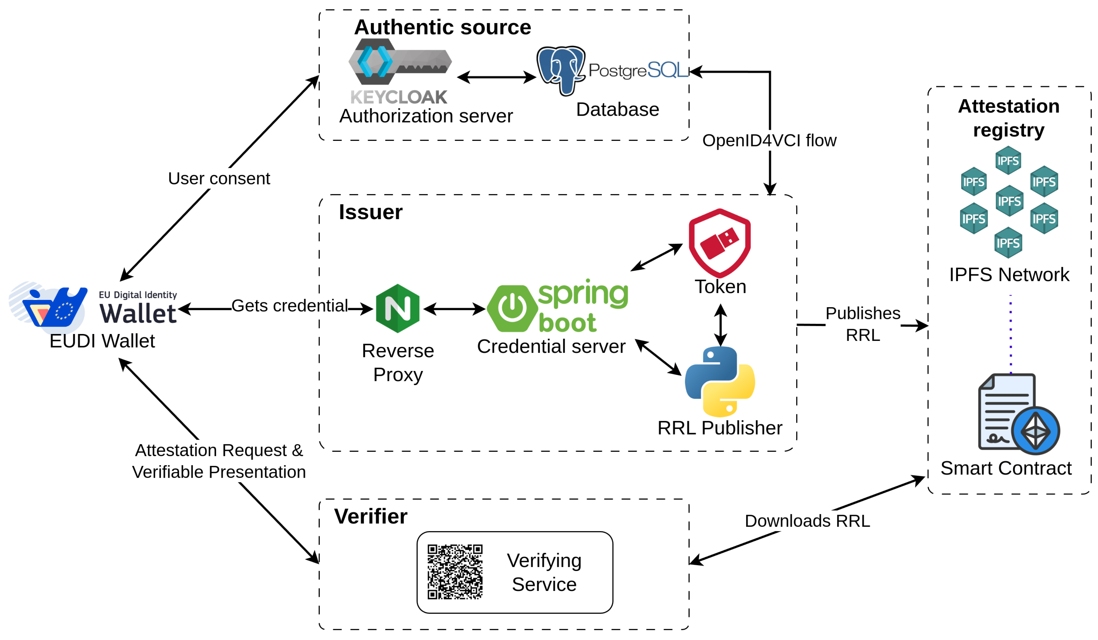 The Authentic Source is used for storing the initial information. For example, this component could be a university holding information about students’ degrees. The Authentic Sources interacts with the Issuer using a variation of OAuth 2.0, namely OpenID4VCI. We opted for Keycloak since it is one of the most supported open-source identity management solutions; it is scalable in terms of functionalities and is already spread worldwide.