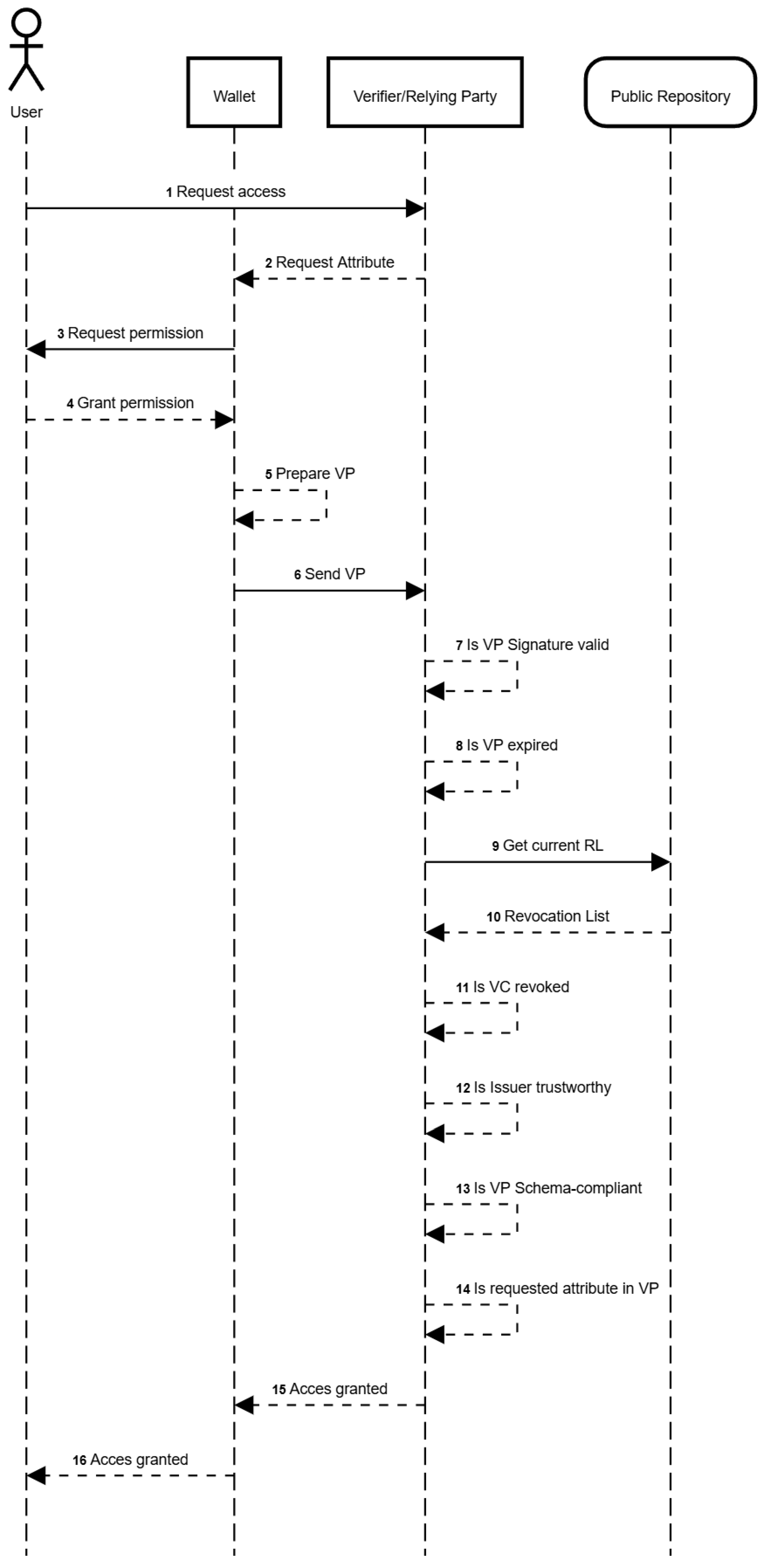 Figure 2 presents the overall flow that takes place whenever a user interacts with a Relying Party. The prepared VP needs to be validated by the Verifying Service. Among the performed validations, we could list the following: attribute schema compliance, signature integrity, issuer trustworthiness, etc.