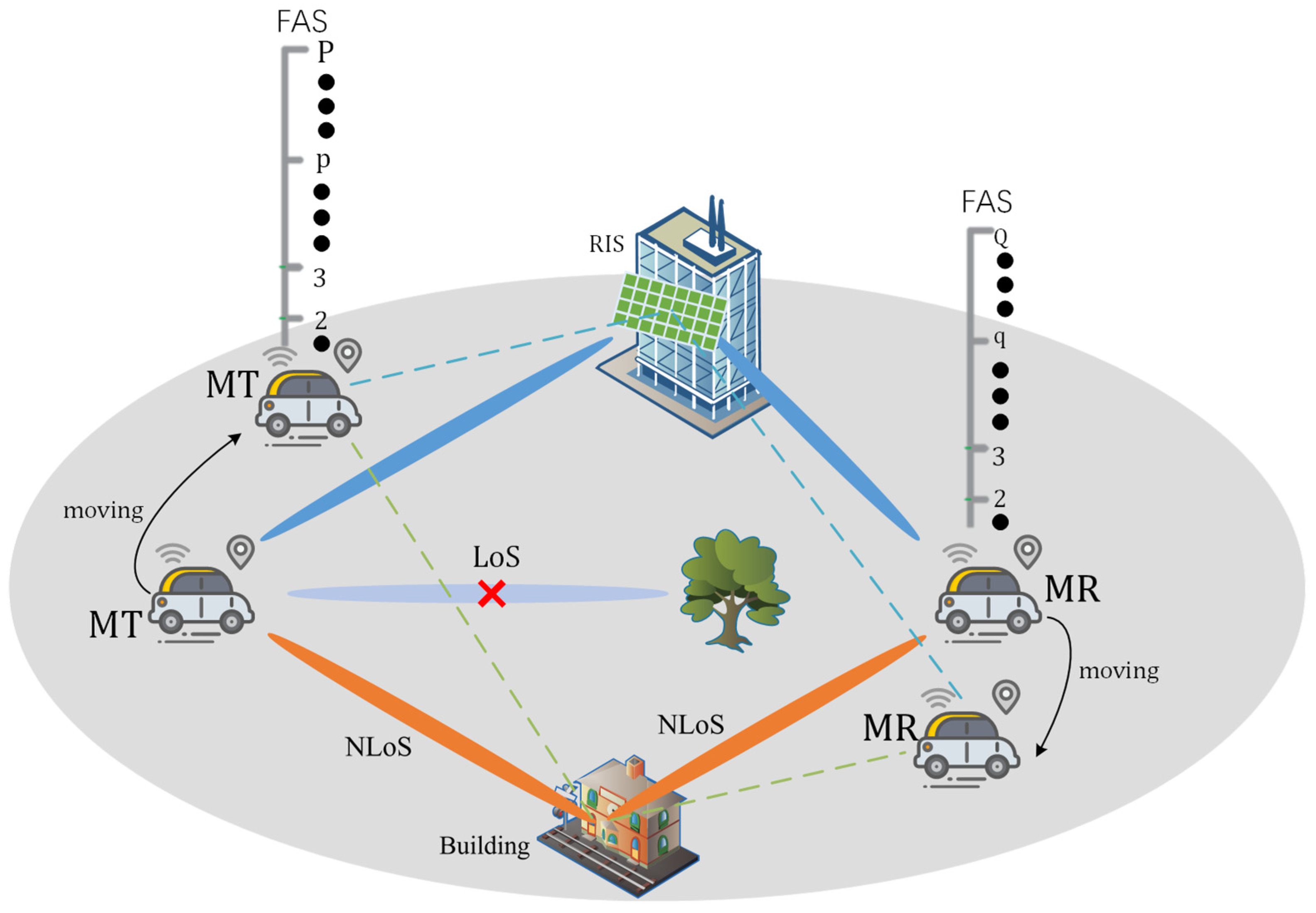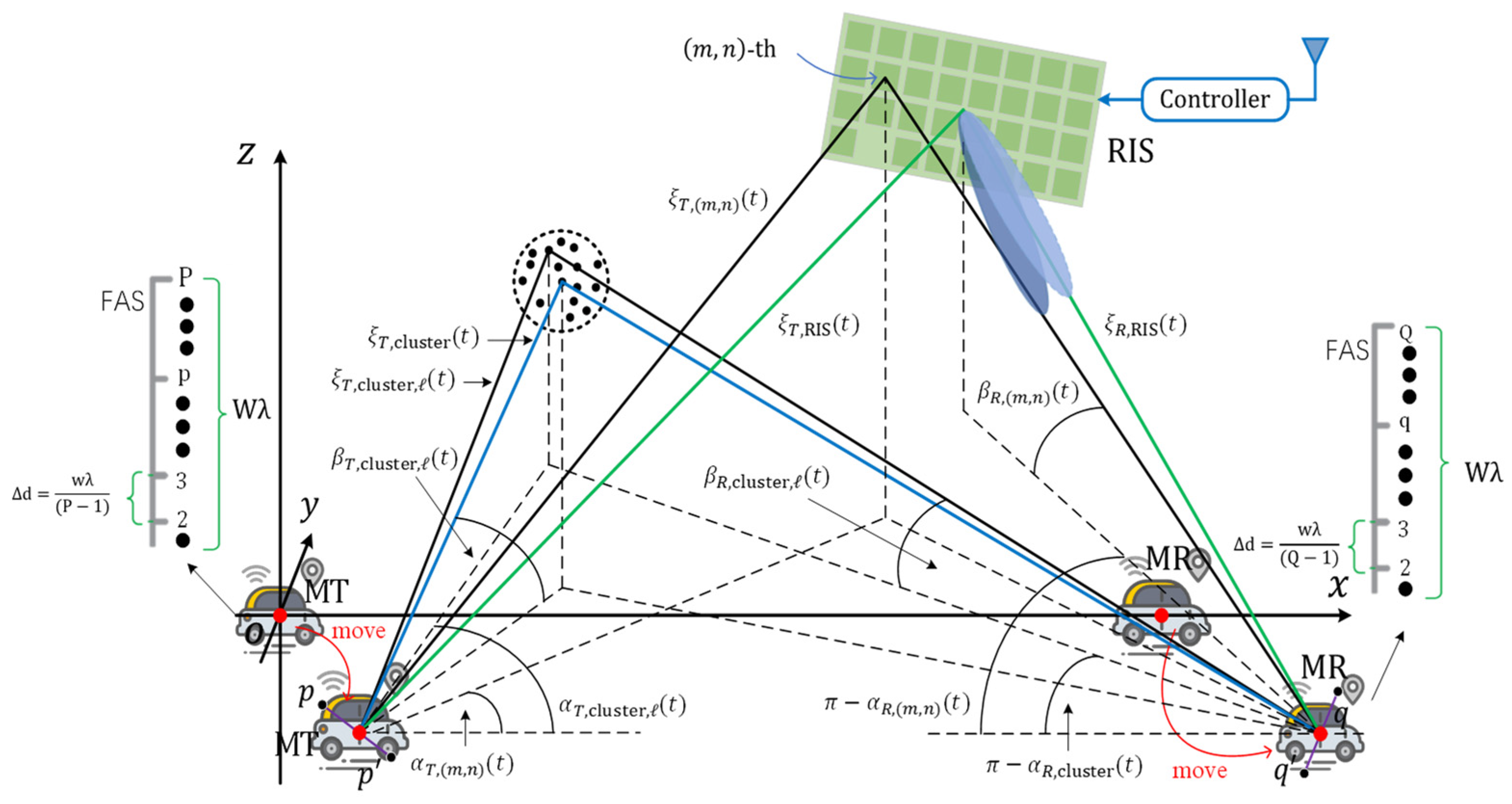 - A channel model is proposed that jointly captures RIS-enabled far-field reflections and near-field scattering effects in dynamic vehicular environments. This model integrates time-varying RIS configurations, spatially non-stationary scatterer clusters, and dual-mobility kinematics of vehicles, addressing the limitations of existing approaches that either neglect near-field dynamics or assume static RIS deployments.