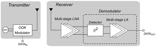 Wireless communications require increasing data rates that can be effectively achieved by exploiting the unlicensed industrial, scientific and medical (ISM) 60-GHz spectrum spanning from 57 GHz to 64 GHz [1]. However, the high atmospheric absorption in this frequency band limits the communication distance, thus enabling only short-range applications [2]. On the other hand, the wide 7-GHz bandwidth centered at 60 GHz guarantees wireless communications at Gbit/s data rates. As far as modulation is concerned, simple modulation schemes are preferred and, specifically, on–off keying (OOK) modulation is largely adopted in the literature since it is compatible with low-complexity circuits and low-power implementations [3,4,5,6,7]. Specifically, in the OOK architecture the receiver adopts non-coherent demodulation. As a result, the receiver does not require a local oscillator (LO), and the transmitter is not dependent on a phase-locked loop (PLL) to generate an exact frequency for the RF carrier [8].