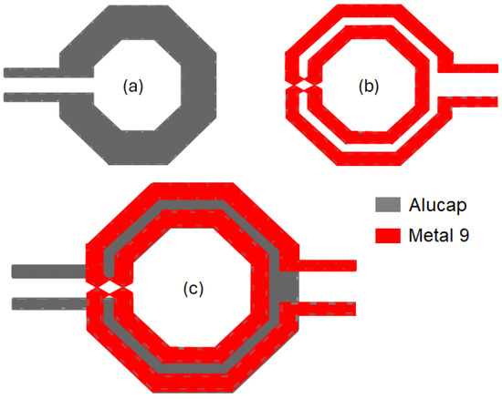 The performance of the LNA is highly affected by the losses of the LC resonant networks formed by the above-described integrated transformers and capacitors (i.e., C2, CL2, CL2 and CL3). In the adopted 28-nm CMOS technology, available standard MOM capacitors have very poor Q-factors at 60 GHz (i.e., about 15) along with very high process variations that impact both gain and frequency bandwidth performance. For this reason, customized differential metal–insulator–metal (MIM) capacitors have been designed to be used instead of MOM capacitors. These MIM capacitors are implemented by means of two top metal layers of AP and M9, as shown in Figure 4. Though not standard, MIM capacitors have been designed to be fully compatible with the TSMC 28-nm process, minimizing reliability risks. The EM-simulated Q-factor is as high as 100 at 60 GHz, which guarantees reduced losses of the resonant LC networks of the LNA.
