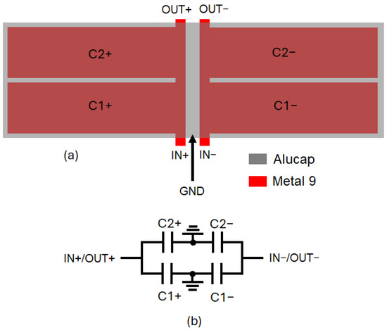 Differential MIM capacitor: layout (a) and equivalent circuit (b).