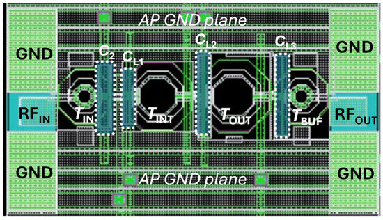 Figure 5 depicts the layout of the 60-GHz LNA core, whose size is 445 µm × 140 µm (excluding PADs for measurement setup), main labels for the LC resonant networks (i.e., transformers and MIM capacitors) and the ground (GND) plane, also included for the sake of clarity. The chip has been drawn for on-wafer measurements through GSG RF probes at both input and output (east/west positions) by using a two-port network analyzer. Multi-contact DC probes (north/south positions, not displayed in Figure 5) are instead adopted for DC biasing. As already detailed in the previous sections, on-chip ESD protection is provided at both RF input and output by means of transformers, TIN and TBUF. A metal GND plane was implemented by using the top alucap layer, while complying with the metal density rules of the adopted technology. At mm-wave frequencies, the layout parasitics highly affect circuit performance, and therefore, careful estimation is of utmost importance. In this design, the overall LNA layout, including integrated transformers (TIN, TINT, TOUT and TBUF), customized MIM capacitors (C2, CL1, CL2 and CL3), transistor connections, DC paths and the metal ground plane, has been EM-simulated with ADS MomentumTM by using the substrate layer description provided by TSMC.