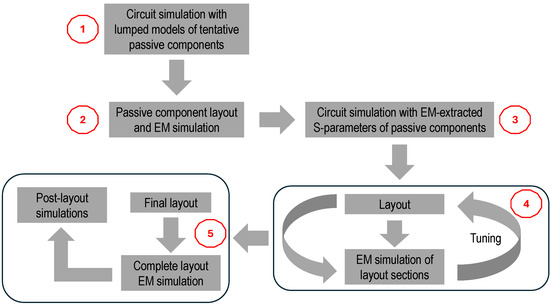 It is worth noting that despite the high computational complexity of such EM simulation, this is mandatory to properly estimate all the couplings taking place in the LNA, thereby helping to identify and eliminate potential sources of instability. However, a full EM simulation of the complete LNA layout was performed only at the final stage of the design process. Prior to this, iterative EM simulations of individual LNA sections—particularly the LC resonant networks—were conducted to guide the design according to the simplified procedure illustrated in Figure 6.