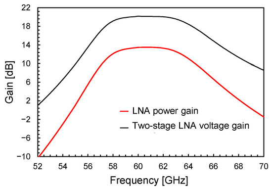 Figure 7, Figure 8 and Figure 9 illustrate the LNA performance at nominal supply voltage and room temperature. The overall LNA current consumption at a 0.9-V supply voltage is as low as 11.6 mA, including 3.2 mA for the output buffer. The input (S11) and output (S22) scattering parameters (S-parameters) are shown in Figure 7. They confirm the soundness of the adopted input/output transformer-based networks, which guarantee wideband matching centered at 60 GHz. Figure 8 depicts the voltage gain of the two-stage LNA, which is as high as 20 dB with a BW3dB of more than 7 GHz, and compares it with the LNA power gain, S21 (i.e., 50 Ω input/output matching), including the output buffer. The amplifier achieves a power gain of 13.5 dB, while preserving a 7-GHz BW3dB centered at 60 GHz.