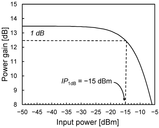 The noise figure of the LNA is shown in Figure 9 and is primarily determined by the first two amplification stages. It reaches approximately 8.4 dB at 60 GHz and remains below 10.5 dB across the entire ISM frequency band. Notably, this performance is achieved with very low power consumption—approximately 10.4 mW—enabled by the PE-SNIM technique. It is worth mentioning that in an actual 60-GHz OOK receiver, such NF performance enables a sensitivity of about −40 dBm, which is better than typical sensitivity values reported in the state of the art. The linearity of the LNA is assessed using the input 1-dB compression point (IP1dB), as illustrated in Figure 10. The LNA demonstrates an IP1dB of around −15 dBm, which exceeds the maximum input levels encountered in typical application scenarios (i.e., about −25 dBm). The stability of the LNA, including layout parasitics, has been verified by using Rollett’s stability factor. Simulations in nominal and worst-case conditions indicate that the amplifier is unconditionally stable.