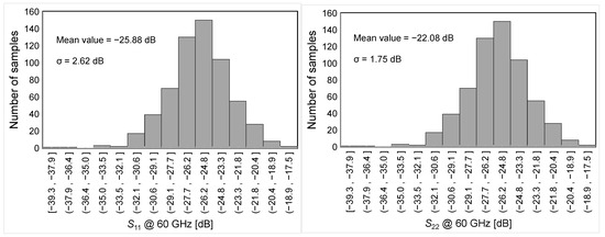 For the sake of completeness, the sensitivity of the proposed LNA is verified by means of Montecarlo (MC) simulations. Figure 11 summarizes the MC results for the main LNA performance parameters, i.e., power gain, NF, S11 and S22 at 60 GHz, BW3dB and IP1dB.