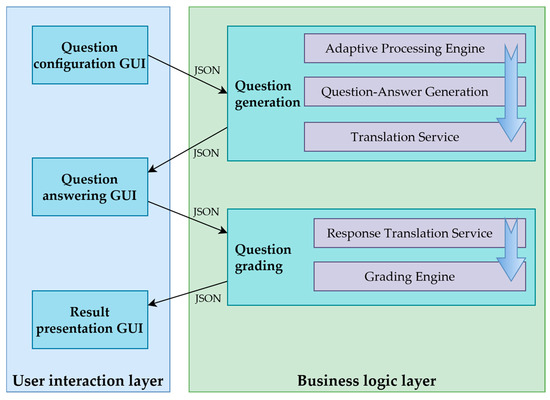Finally, both the question-generation and question-grading modules communicate with the GUI layer by exchanging JSON-formatted interaction responses. The following paragraphs of this section will elaborate on each stage of the system pipeline.