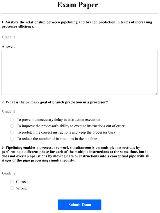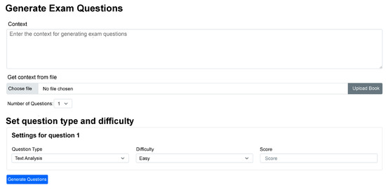 One area where this potential can be fully appreciated is the examination process. The conventional approach to creating examination papers is a manual process that is not only time-consuming, tedious, and repetitive but also places a considerable burden on educators, especially when dealing with large student populations. This method increases the likelihood of inefficiencies, such as potential bias, the reuse of questions across examination periods, and the under- or over-representation of syllabus sections, often compromising the integrity and fairness of the process [2]. These challenges are further amplified in the modern educational landscape. The ongoing rise of remote examinations [3] has created an urgent need for diverse and dynamic questions to maintain academic integrity. Furthermore, in today’s increasingly globalized and multicultural classrooms, language barriers can compromise the fairness and clarity of assessments [4]. Regarding exam grading, the manual process is labor-intensive and prone to inconsistencies, making it difficult to provide detailed feedback due to heavy workloads, which can often cause unnecessary delays [5,6]. Finally, while theoretical texts offer students detailed explanations, they often lack the interactive exercises needed to apply and evaluate that knowledge, creating a gap between theory and practice.