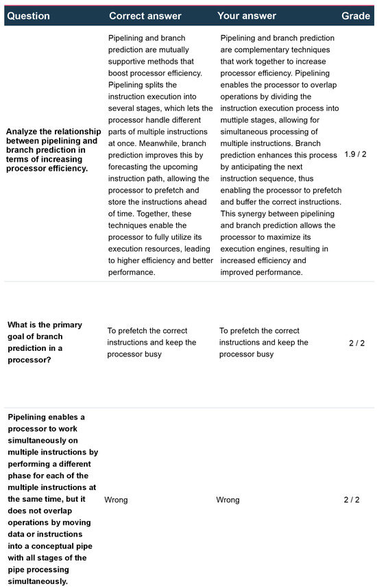 Figure 2, Figure 3 and Figure 4 illustrate the user interface design of the system, which is a critical aspect for adoption in real-world educational settings. The interfaces were intentionally designed with simplicity and clarity to support instructors with minimal technical expertise. Figure 2 demonstrates the first step of the exam process, which is a configurable question-generation interface, enabling educators to tailor content based on difficulty and topic. The context—which corresponds to the examination material—can be entered via a text box or uploaded as a file. Afterwards, the user specifies the number of questions to be generated and, for each question, the type of question (long text, short text, or multiple-choice with single or multiple selections). Figure 3 shows the second step of the examination process, i.e., a student-facing question-answering interface presenting the questions that were generated in the first step, designed to reduce cognitive load during exams. Finally, Figure 4 illustrates the third step of the examination process, when grading results are presented along with a visual summary of performance. The student’s answer is listed together with the correct answer and the grading to facilitate the identification of weak areas and provide insight into the grading rationale. This view is available to both the examiner and the student. These GUI elements are essential for usability, especially in non-technical academic environments, and they represent a key differentiator from back end-only solutions.