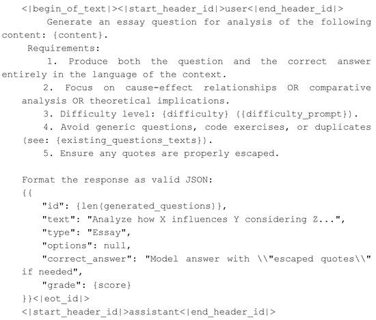 Figure 5 illustrates a prompt that was meticulously designed to generate essay-type questions tailored to the provided content. This prompt serves as the primary interface between the user’s specifications and the underlying generation model, encapsulating all constraints and objectives necessary for producing high-quality assessment material.