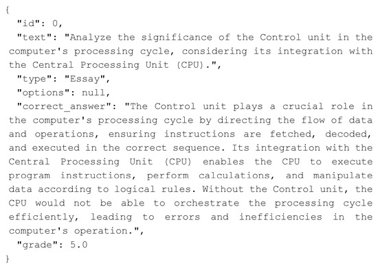 The “type” field specifies the question format in compliance with the prompt’s explicit instruction to generate essay questions and exclude other formats such as code exercises or generic multiple-choice tasks (Requirement 4).