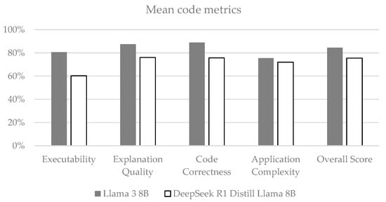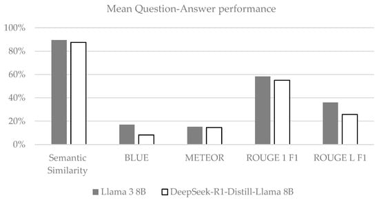 Regarding the METEOR score, both models demonstrate comparable performance (15.22% vs. 14.51%) and exhibit high consistency, with both showing very low standard deviations (1.15% and 1.55%, respectively). A similar pattern of close mean performance is observed for ROUGE-1 F1 (58.45% vs. 55.15%), though Llama 3 8B demonstrates greater stability (SD = 2.60%) compared to the DeepSeek model (SD = 4.50%). On the other hand, when the ROUGE-L F1 metric, which captures the longest common subsequence, is considered, Llama 3 8B achieves a clear performance edge, scoring 35.99% versus DeepSeek’s 25.76%. As with the BLEU metric, this higher average performance from Llama 3 8B comes with a trade-off in consistency; it is more variable (SD = 6.44%) compared to the highly consistent DeepSeek model (SD = 1.71%).