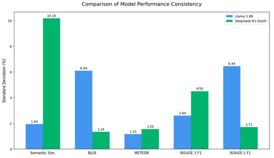 Figure 8 illustrates comparatively the performance of the two models across 10 successive executions, highlighting notable trends in the quality of generated question–answer pairs. Both models exhibit high alignment with the context, with mean semantic-similarity scores of 89.54% for Llama 3 8B and 87.57% for the distilled DeepSeek model. However, an analysis of performance uniformity, as detailed in Figure 9, which illustrates the standard deviation of results, reveals a critical distinction. Llama 3 8B is significantly more stable, exhibiting a low standard deviation equal to 1.94%. In contrast, the DeepSeek model demonstrates considerable volatility in its semantic understanding, with a much higher standard deviation of 10.16%. This indicates that, while both models perform well on average, Llama 3 8B’s performance is more consistent and reliable.