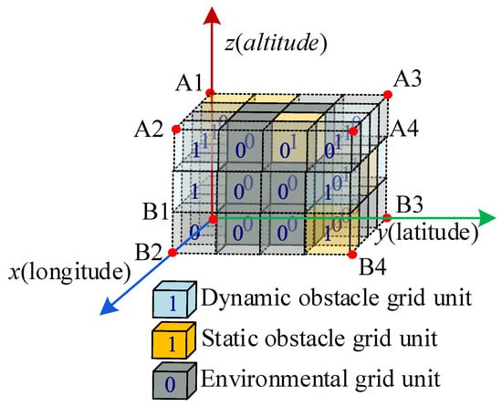 As shown in Figure 1, the article represents spatial information by dividing the low-altitude flight environment space of the drone cluster into regular grids, with each grid initially representing a small area in the low-altitude flight environment. For the presence of obstacles that threaten the low-altitude flight of drones in the flight environment space, each grid can be marked as 0 or 1, where 0 indicates that there are no obstacles in the grid and 1 indicates that there are obstacles in the grid. Furthermore, in order to distinguish the differences between dynamic and static obstacles, the grid cell attributes were refined using color labeling method. In the space of Figure 1, the entire environmental space is regarded as a huge cube and a three-dimensional Cartesian coordinate system is established on this basis. Among them, the B1–B2 direction is the x-axis of space, B1–B3 is the y-axis, and B1–A1 is the z-axis, representing the longitude, latitude, and altitude of the low-altitude flight environment space of the drone cluster, respectively. Then, the space is divided equally along the three-axis direction, and the space is divided into multiple grids along the B1–B2, B1–B3, and B1–A1 directions, ultimately forming a low-altitude flight environment spatial grid model for the drone cluster.