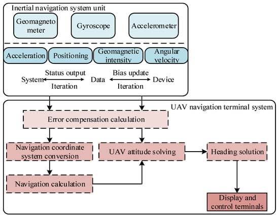 Inertial navigation systems (INS) do not rely on external GPS signals and can provide continuous, real-time position, velocity, and attitude information in complex low-altitude environments, ensuring high-precision autonomous positioning even when GPS is denied or interfered with. By updating the status of inertial navigation, cluster drones can synchronize their respective motion states, reducing the impact of accumulated errors on collaborative flight. However, due to the advantages of stable sensing data and immunity to external interference in inertial navigation systems, and the fact that accelerometers in inertial navigation devices can measure the acceleration information of unmanned aerial vehicles, gyroscopes can output angular velocity information, and magnetometers can sense geomagnetic intensity, these data are derived from sensing data during the flight of unmanned aerial vehicle clusters, and can be used as a basis for updating the flight status of unmanned aerial vehicle clusters without GNSS signals as an auxiliary navigation. To clarify the source of sensing data, the working principle of the unmanned aerial vehicle’s strapdown inertial navigation system is described in Figure 2.