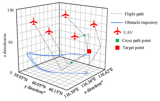 In Equations (15)–(16), h0(O) denotes the target attraction potential field; e denotes the reference potential energy strength; κ1 and κ2 denote the potential field skewness between the target attraction potential field and the obstacle repulsion potential field; e0 denotes the basal potential energy strength; (x1, y1, z1) denote the UAV initial position coordinates; h1(O) denotes the obstacle repulsion potential field; (x2, y2, z2) denote the position coordinates of the obstacle distribution that exists within the low-altitude flight environment; φ denotes the initial paths of all the UAVs; and T denotes the time window of the path intersection point.