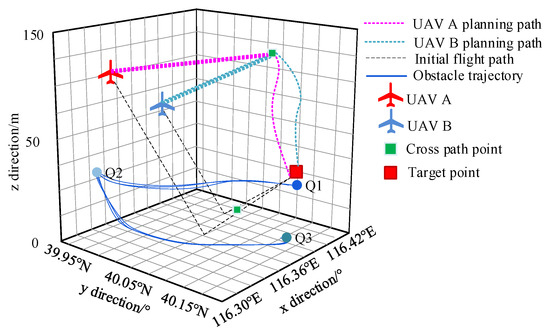 To further verify the effectiveness of the design method in low-altitude flight cross-path planning, based on the environment model in Figure 3, two unmanned aerial vehicles A and B with path intersection areas were selected. The initial position of unmanned aerial vehicle A (measured after ascending altitude) was (116.34° E), 40.10° N. The initial position of drone B is (116.36° E, 40.05° N, 75 m), at the given unmanned aerial vehicle cluster inspection target point of (116.39° E, 40.00° N. On the basis of 50 m, the distribution of random obstacles is normalized in the simulation scene to generate the trajectory of movement from Q1 to Q2 and then to Q3. The planning effect after visualizing the application design method using a 3D grid environment model is shown in Figure 4.