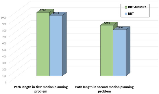 Comparisons of the path length between the proposed RRT-GPMP2 algorithm and RRT global planning in both motion planning problems. Data in the figure are measured in meters.