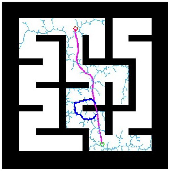 To evaluate the performance of the proposed RRT-GPMP2 algorithm in larger and more complex maze environments, we also employed it in a 1000 × 1000 resolutions map as demonstrated in Figure 7. The hardware platform and step length for RRT local re-planning remain unchanged from the previous simulations in two self-constructed complex mazes. In GPMP2 global planning, the start position is [600, 150] and the goal position is [440, 840]. In RRT local re-planning, the start position is [573, 328] and the goal position is [552, 403]. Based on the results in Figure 7, the robustness and scalability of the proposed RRT-GPMP2 algorithm are validated. Nevertheless, if the complexity and scale of the maze continues to increase, the proposed RRT-GPMP2 algorithm might not be able to generate a feasible path as there might be multiple complex collision parts on the generated path. As a result, additional strategies based on the proposed RRT-GPMP2 algorithm should be proposed to further solve this problem.