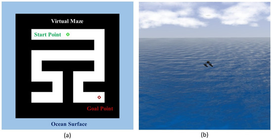 There are several maze-like scenarios in the inshore maritime environment such as the complex, maze-like ports. In this path-following mission in ROS, a virtual maze is assumed to exist on the ocean surface in the ROS simulation environment. In this virtual maze, the selected wave adaptive modular vessel (WAM-V 20 USV) follows a path generated by the proposed RRT-GPMP2 algorithm based on the fully autonomous USV navigation framework. Figure 8a demonstrates the locations of the virtual maze, start point and goal point, while Figure 8b provides an overview of the ROS simulation environment of the path-following mission. As demonstrated in Figure 8a, the positions of the start point and goal point are [400, 100] and [400, 400], respectively. As demonstrated in Figure 8b, a WAM-V 20 USV is initialised at a point on the ocean surface and the maze configuration is implicit in ROS. The maze obstacle configuration is modelled in MATLAB, where the path is generated and subsequently transferred to Gazebo (https://gazebosim.org/home) via a ROS node.