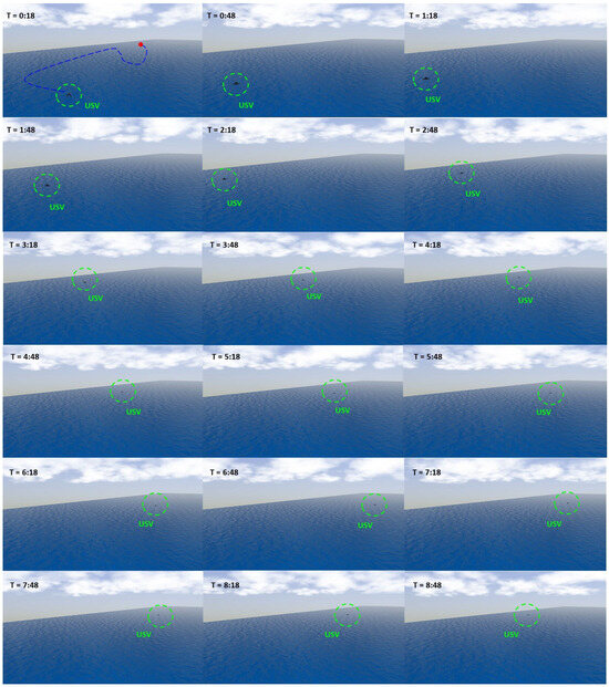 The storyboards of the path-following mission using the proposed RRT-GPMP2 algorithm. In the first sub-figure, the schematic diagram of the path to be followed is represented as the blue dashed line and the goal point is represented as the red point. Specifically, the storyboards record the state of the USV from 0 [min] 18 [s] to 8 [min] 48 [s]. The USV moves towards the start point from a nearby point between 0 [min] 0 [s] and 0 [min] 18 [s]. The USV roughly reaches the goal point at 8 [min] 48 [s]. As mentioned earlier, this simulation was conducted in a ROS simulation environment based on the previous work in [19,23].