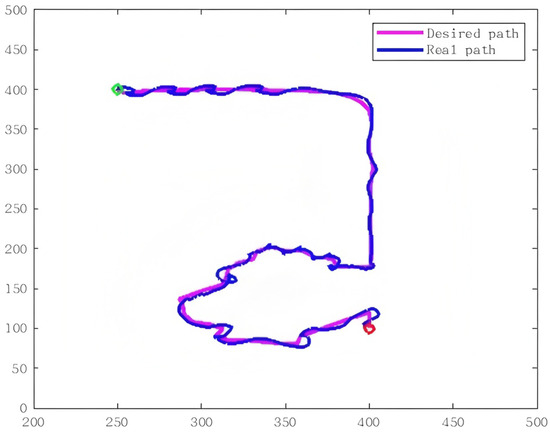 As demonstrated in Figure 10, the path generated by the proposed RRT-GPMP2 is feasible for the USV to navigate in the virtual maze on the ocean surface. Compared with the desired path, although some drift occurs in the real path, this is primarily caused by limitations of the autopilot and controllers. Furthermore, the part generated by GPMP2 global planning is relatively easy for the USV to follow, resulting in smaller tracking errors compared to the part generated by RRT local re-planning. This validates the effectiveness of employing GPMP2 as the global planning method while utilising RRT local re-planning as a supplementary method for maze navigation.