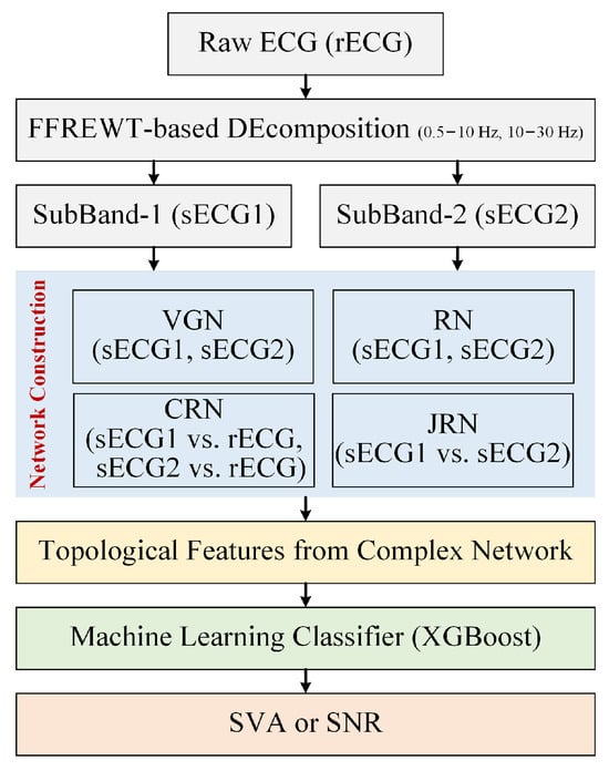 To address these issues, complex network analysis has gained interest. By representing ECG signals as networks, it enables the analysis of temporal and spatial dynamics through graph-theoretic measures []. Metrics such as degree distribution, clustering coefficient, and shortest path length reflect signal complexity and structure, aiding arrhythmia classification []. Garcia et al. demonstrated high accuracy using network features for arrhythmia classification [], while Liu et al. used network centrality measures to distinguish VF and VT from non-shockable rhythms []. Moreover, complex network analysis can be integrated with machine learning and deep learning techniques to enhance both interpretability and classification performance []. However, most existing methods focus solely on either single-frequency-band analysis or a single network model, which neglect important dynamic and cross-frequency interactions within ECG signals. To address these limitations, a multi-band, multi-network framework combining lightweight signal decomposition and interpretable network-based features is presented [] to balance detection performance with computational efficiency for mobile health applications.