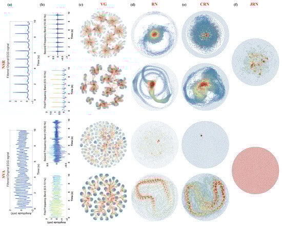 The typical ECG decomposition signals and corresponding complex networks of SVA and NSR segments. (a) Filtered original ECG signals, (b) decomposed sub-signals of two sub-bands, and (c–f) corresponding complex networks (VGN, RN, CRN, and JRN) of these sub-signals. The color of each node in the network diagram aligns with the color of the corresponding data point in the sub-signals, reflecting the degree of the node.