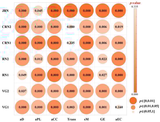 For each network type (VGN1, VGN2, RN1, RN2, CRN1, CRN2, and JRN), we extracted the values of seven network features, including aD, aPL, aCC, Trans, sM, GE, and aEC, from all time series samples. Then, for each feature within each network type, a Kruskal–Wallis test was performed to assess whether the distributions of feature values significantly differed between NSR and SVA. Figure 3 summarizes the p-values obtained from these tests, indicating the discriminative ability of each feature for distinguishing NSR and SVA data under different network representations. Each circle in the matrix represents a p-value. Its color and size reflect the value: larger and redder circles indicate lower p-values (stronger significance), whereas smaller and bluer circles correspond to higher p-values (weaker significance). The majority of p-values fall within the highly significant range (p ≤ 0.01), suggesting that most features exhibit statistically significant differences among groups. Features such as aD, aPL, aCC, and GE demonstrate consistent significance across nearly all groups, highlighting their robustness and potential importance in downstream analyses or classification tasks. In contrast, the feature Trans shows relatively higher p-values in CRN1 (p = 0.335) and CRN2 (p = 0.080), indicating a lack of statistical significance in these contexts. Similarly, aEC does not reach statistical significance in VG1 (p = 0.160), whereas in CRN2 it is only marginally significant (p = 0.019).