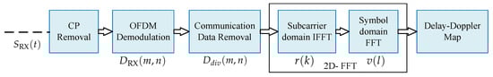 To extract the time delay and Doppler frequency shift contained in the echo signal, a conventional processing approach involves removing the communication data and applying 2D-FFT [14]. The block diagram of the overall algorithm is shown in Figure 2.