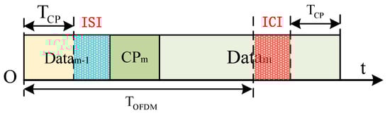 As shown in the original sensing algorithm, its performance largely depends on the ability to remove communication information, which in turn relies on the completeness of the received signal. As demonstrated in Figure 3, when the reception delay exceeds the CP duration, the received signal includes components from the preceding OFDM symbol (), resulting in ISI. Simultaneously, the current symbol () is only partially received, disrupting the orthogonality of the OFDM waveform and introducing ICI. These two forms of interference hinder the accurate removal of communication content and significantly degrade the algorithm’s overall sensing performance. The detailed derivation of interference can be found in [19] and is not repeated here.