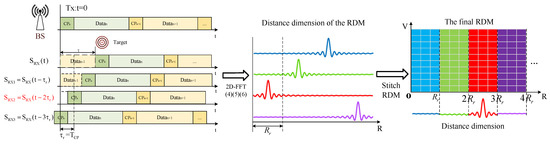 where the delay step size is . Then, the received signal is processed using the algorithm from Section 2, as shown in (5)–(7). The above process is iteratively performed until the observation distance covers the maximum sensing range. Obtain multiple segments of RDMs, whose range dimension can be expressed as