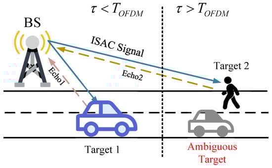 At present, research on ISAC waveform design is predominantly centered around communication-centric approaches [11], most notably by adapting and extending the widely adopted OFDM waveform to support joint sensing capabilities. The OFDM signals exhibit excellent performance, offering high data rates, strong interference resistance, and flexible parameter configurations [12]. Moreover, the ambiguity function of OFDM signals exhibits a thumbtack-like shape, with its continuity facilitating coherent accumulation [13]. As a result, numerous radar algorithms based on OFDM have been proposed in the academic community [14,15,16,17]. However, the implementation of sensing functions using OFDM is subject to range limitations [18]. Specifically, the maximum sensing range is constrained by the CP duration, which is typically longer than the maximum delay spread. When the echo delay exceeds the CP duration, inter-symbol interference occurs, leading to significant degradation in detection performance [19].