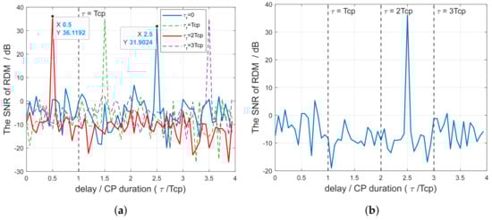 In Figure 6, the delay compensation-based sensing algorithm described in Section 3 is compared with the traditional algorithm. Set the target delay as , with the receiver compensating for a delay of at each iteration. Set the number of iterations to 4. The zero-velocity dimension data extracted from these RDMs is shown in Figure 6a. By extracting the data before and concatenating them, the final RDM is obtained, as shown in Figure 6b. The x-axis represents the ratio of the delay caused by the target to the CP duration, while the y-axis represents the ratio of the accumulated target energy to the noise energy after the original signal is processed using (5)–(7), which corresponds to the SNR after range-Doppler processing. The simulation does not account for the attenuation caused by the target’s distance and RCS, and the original SNR of the echo signal is 10 dB.